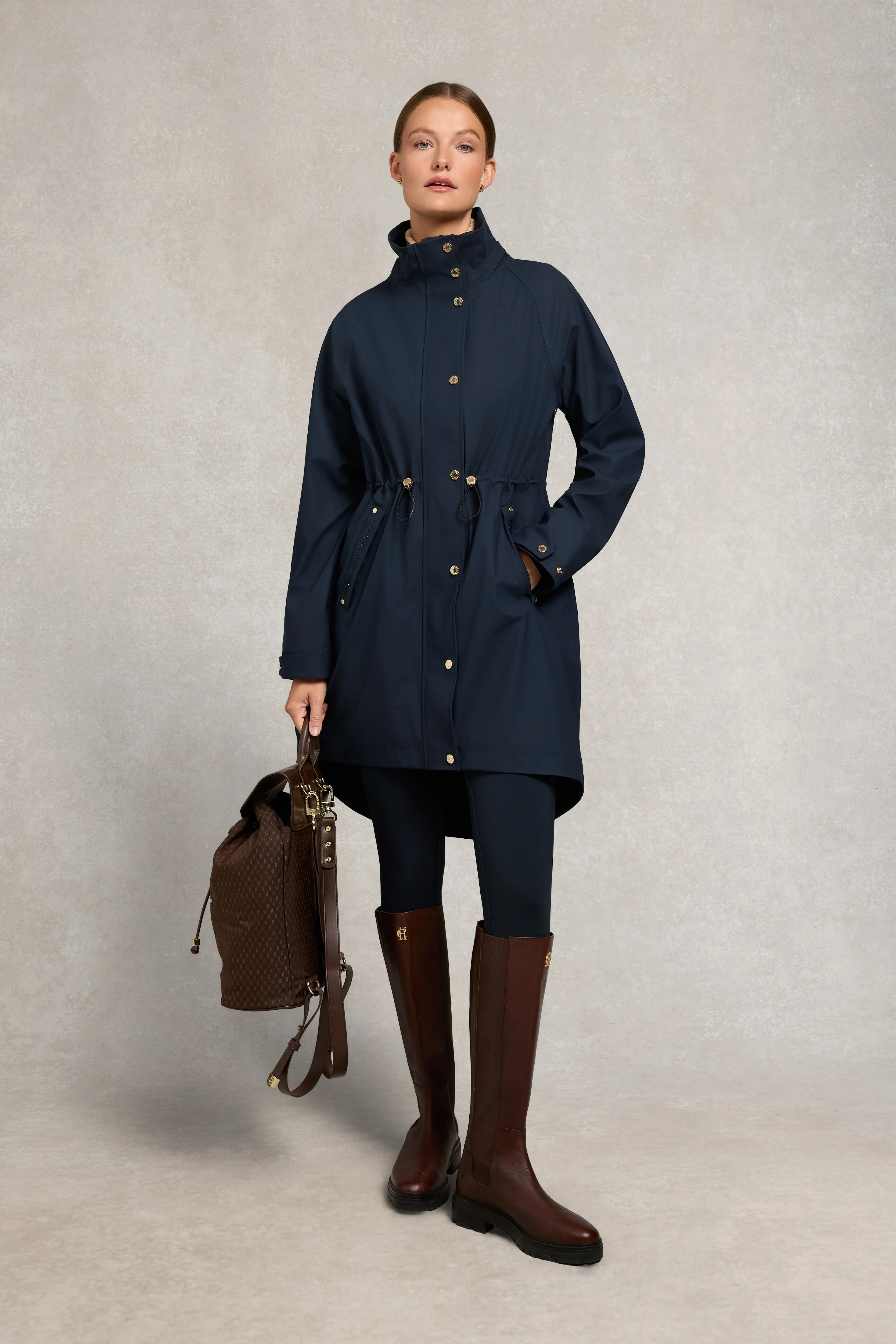 The Chartwell Rain Parka has been thoughtfully designed for style, versatility, and performance. This season, the fabric has been further improved and elevated, delivering enhanced durability and a refined feel while maintaining exceptional waterproof protection. Seam-sealed construction and waterproof zips ensure you stay dry in harsh weather. The classic parka silhouette is shaped by an adjustable waist and cuffs, allowing you to personalise the fit. Deep lower welt pockets feature silicone-printed Holland Cooper branding, while fresh matte black coated hardware completes the contemporary look.